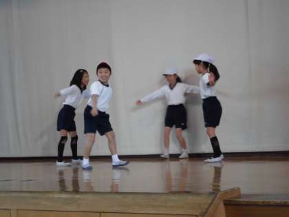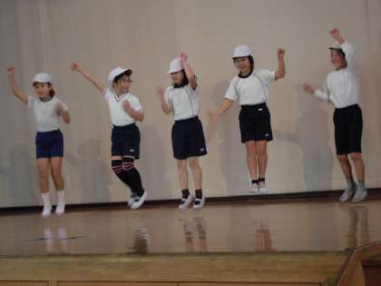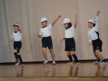 体育の学習では,軽快なリズムの音楽に乗って,全身で弾んで踊ったり,友達と動きをまねし合ったり,手拍子を付け合ったりして楽しく踊っています。そして,グループごとに,いきものがかりの「ジョイフル」の曲に合う踊りを考えて,今日,発表会をしました。