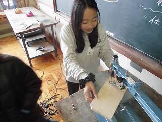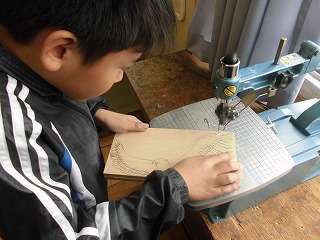 図工では電動のこぎりで板をきりぬいて作るセロテープカッターを制作しています。