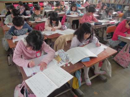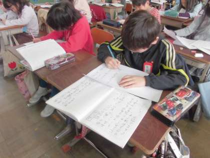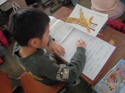 「スーホの白い馬」のお話を紹介する紹介文を書いています。話の展開を確かめながらあらすじをまとめ,お話の中で,一番心が動いたところを中心に紹介することをまとめました。出来上がった紹介文を使って,お家で紹介してもらいますので,楽しみにしていてください。