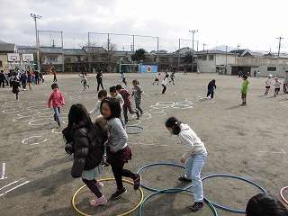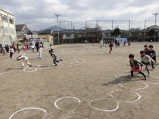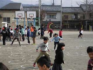 大会といっても運動委員会の児童が運動場にけんけんぱの丸をたくさん書いて,低学年の児童がどんどんとんでいくというものです。