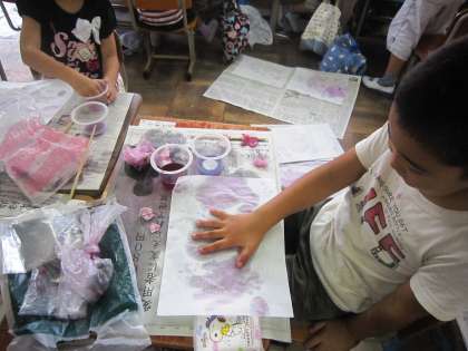 花に水を加えると,水がきれいな紫色になりました。さらにお酢やせっけん水を加えるとピンクや青色に水が変化して,みんな大喜びでした。半紙に字を書いたり,絵を描いたり,手形をつけたり,それぞれに色水遊びを楽しむことができました。
