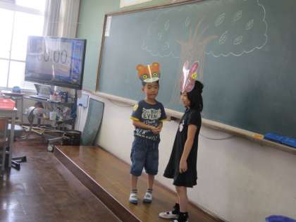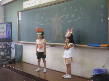 国語では「ゆうだち」のお話を学習しています。今日は,たぬきの子,うさぎの子,ナレーター役に分かれて,3人組で音読劇を発表しました。それぞれ自分たちでセリフを新たに付け足して,登場人物の気持ちを考えながら音読発表をすることができました。その後,ゆうだちのお話の中に出てくるうさぎの子やたぬきの子と自分が似ているなと思ったところなどを考えて発表しました。「けんかをしても仲直りをすることで本当の仲間・友だちになれる。」という意見や,「自分からちゃんとあやまるよ。」という意見も出て,まわりの人と仲良くできるみんなの考えが素敵でした。