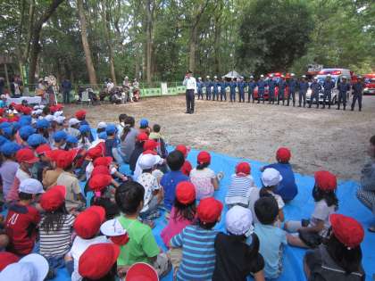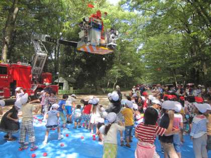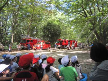 今日,1年生は下鴨神社・糺の森で行われた「糺の森こども防火コンサート・消防車運動会」に行って来ました。「幼稚園や保育所のころにも行ったことある〜!」と言っていた人もいましたが,本物の消防車や消防士さんを見るとみんな目をキラキラさせて見ていました。そして,小学校1年生らしいマナーでコンサートを楽しみました。消防車運動会では,赤組と白組に分かれて,はしご車の上に向かって玉入れをしました。その後,消防訓練では,ホースから大量の水を放水する訓練を見ることができました。「すごい!かっこいい〜!」の声がたくさんあがっていました。