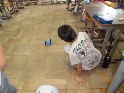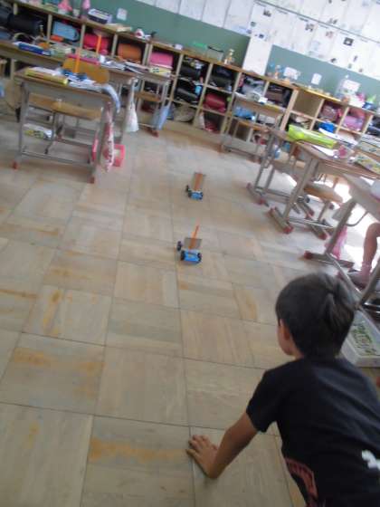 風の強さや風を受ける紙の大きさ,形の違いによって,車の動き方はどのように違うのだろうかと,子どもたちはそれぞれ予想してから,実験に楽しんで取り組んでいました。