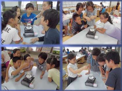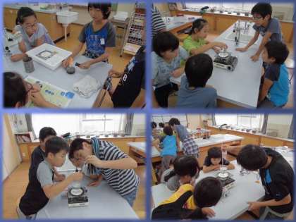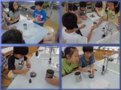 理科室にある器具や道具を確認し,理科室での使い方を学習しました。そして,マッチやアルコールランプ,実験用ガスこんろの安全な使い方を学習し,実際に火をつけて練習しました。マッチを擦るときに,一発でつけれた子もいれば,怖がってなかなかつけれなかった子もいましたが,安全に学習できるようにしっかり練習しました。