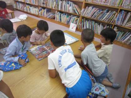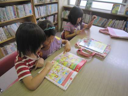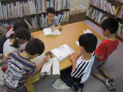 1年生は毎週木曜日に図書室に行って本を借りています。本が好きな子どもがいっぱいで,4月からつけ始めている読書ノートももう100冊を超えている人がたくさんいます。今日の図書室の時間もみんなとても楽しみにしていました。借りていた本を返し,そして早速新しく本を借り,座ってお友だちと一緒に読んだり,一人でじっくり読んだりと,みんなさまざまに今週も図書室の時間を楽しみました。