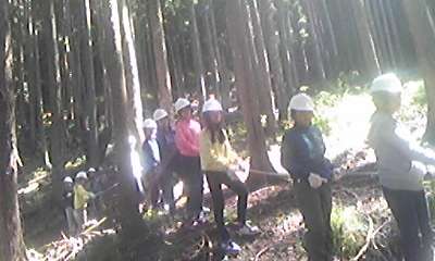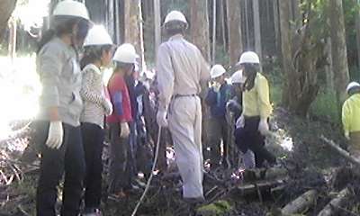 ゲストティーチャーからのお話を聞き,いよいよ間伐体験です。安全に気を付けて,真剣に,でも,楽しんで取り組みます。