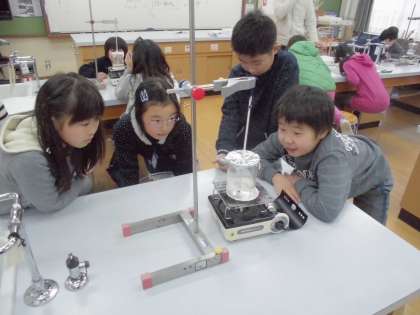 グループで時計係,温度係,観察係と役割を決め,やけどをしないために注意すべきことを確認して,20分間水を熱し,水の温度の変化と目に見える水の変化を観察しメモしました。また,熱する前と熱した後とで水の量を比べたり,調べた温度の変化をグラフに表したりしました。