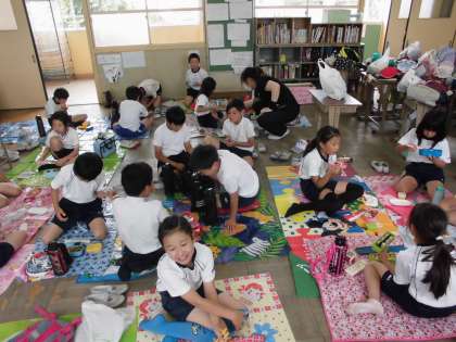 午前中のよさこいソーランが終わって子どもたちはひと段落ついておいしいお弁当を食べました。