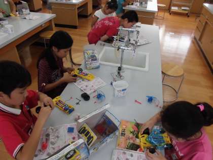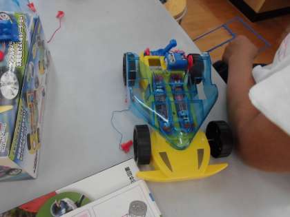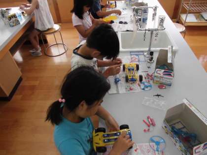 設計図を見ながら頑張って作りました。電池の+極と−極をわざとさかさまにして逆走するモータカーにしている子どももいました。