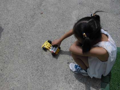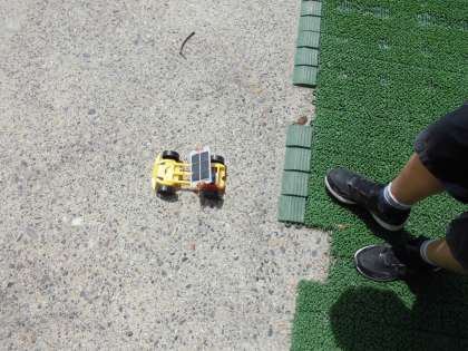 乾電池の代わりに光電池を使って運動場でモーターカーを走らせました。