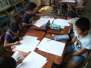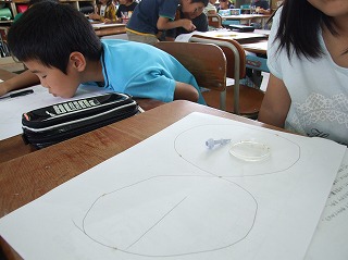 今日はありの行列がどのようにしてできるのかを地域指導者の方に教えてもらいました。ボールペンのインクがありのフェロモンと似たにおいがすることを知り,実際にボールペンで線を書いて,シロアリに歩いてもらいました。