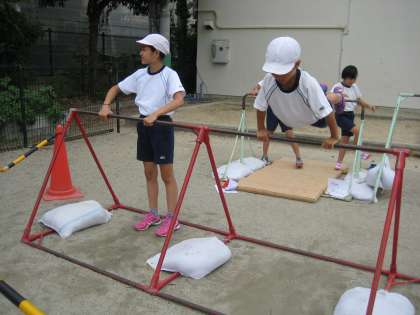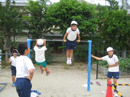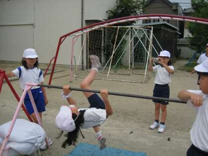 5年生は体育で鉄ぼうの学習をしています。