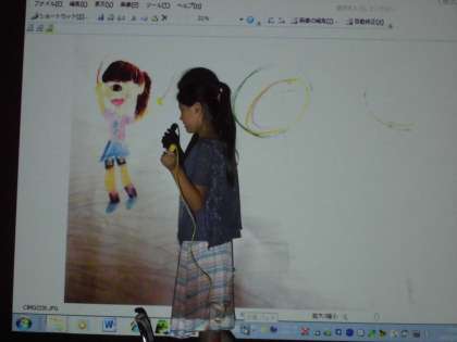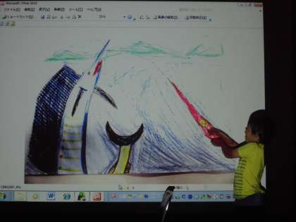 前の時間に各自が描いた絵をプロジェクターで映し出し,その前で子どもがポーズをとりました。物語の主人公になって子どもは場面の様子を紹介しました。