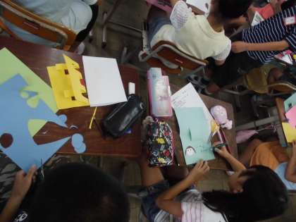 もう一つのクラスは先週から「とび出すカード」に入っていますので,今日からカードを作り始めました。子どもたちはイメージスケッチをもとにして作りました。