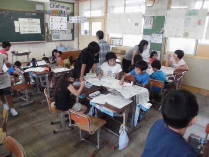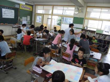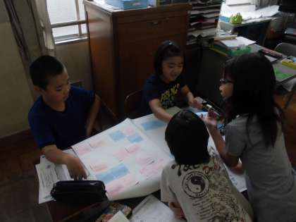 模造紙に張り付けた付箋紙をテーマごとに分類し,エコな生活をするためにどのようなことをしていかなければいけないかを班で話し合いました。