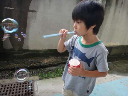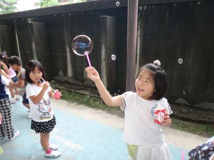 夏ももうすぐ終わりです。最後の夏遊び!ということで、「シャボン玉遊び」をしました。大きなシャボン玉や小さくてたくさんのシャボン玉、2人で双子のシャボン玉など、それぞれ工夫してシャボン玉遊びを楽しんでいました。