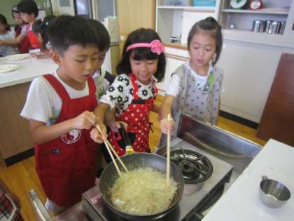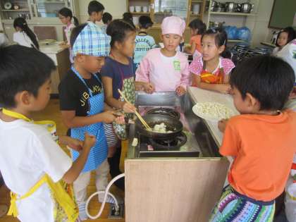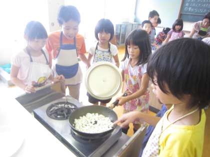 ポップコーンをはじけさせた後は,いったん取り出して,キャラメルづくりです。マシュマロとバターをフライパンに溶かして,ぐつぐつすると…キャラメル色になってきました!そこにさっきはじけさせたポップコーンをもどして,おいしいキャラメルがからんだキャラメルポップコーンが完成です。塩味もキャラメル味もどっちもみんなで分け合って仲良く食べました。その後の給食も,全部おいしく食べた2年生。さすがです!今日は,たくさん食べておなかいっぱいだね!!