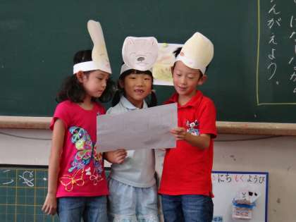国語科「ゆうやけ」の最後の場面。どんな話をしながら3びきは帰っていったのか、考えたことを発表しました。お面をつけただけでにっこり。かわいらしい会話がたくさん出てきました。