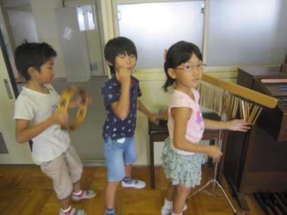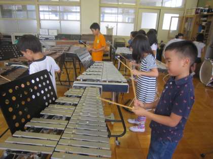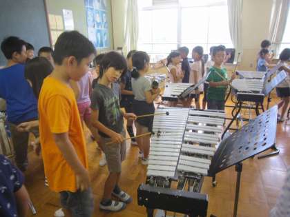 最近はめっきり涼しくなって秋の風が吹きはじめました。秋の虫の声も聞こえてきました。2年生は音楽で「虫のこえ」を演奏練習しています。鈴虫や松虫の虫の声をけんばんハーモニカ以外の楽器で表現できないかと,音楽室にやってきました。いろいろな楽器を試して,「これすずむしみたい!」とか「これガチャガチャって聞こえる!」などと友だちと言っている姿が素敵でした。