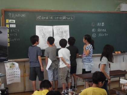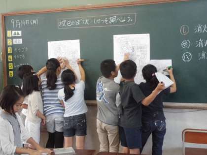週末に調べてきた「校区にある火事を防ぐ施設」大きな校区地図に書き込みました。