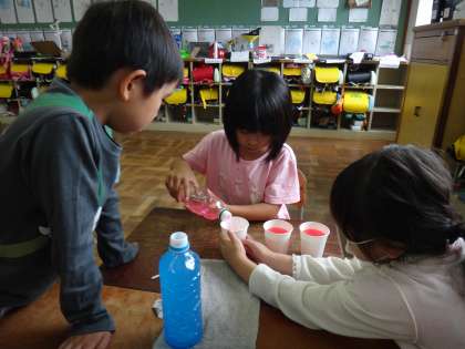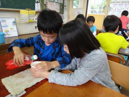 正確に比べるために、一滴もこぼさないよう慎重に水を移す姿から一生懸命さが伝わってきました。