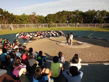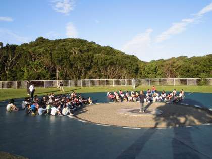 みさきの家2日目。晴天に恵まれ とても気持ちの良い朝をむかえました。6時起床が,みんで力を合わせ,寝具の後片づけを行い,予定より早く終わりました。7時からの修学院第二小学校との「朝の集い」でしたが,20分前に準備ができたので,芝生広場で遊ぶ余裕もありました。7時から始まった朝の集いでは,校歌を歌ったあと,それぞれの学校紹介などをして交流を深めました。