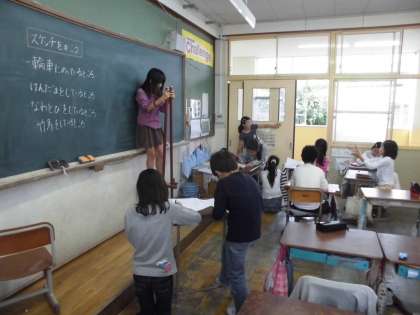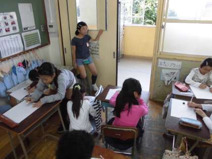 互いにモデルになり友達同士で一輪車をしている様子や,竹馬をしている様子を描きました。