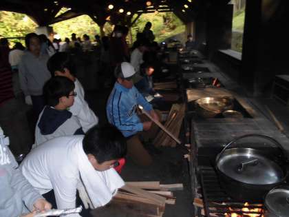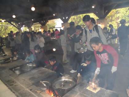 先ほど「火おこし」で作った「火」を使って,かまどに点火しました。マッチやチャッカマンを使わず,調理ができることに感激していました。