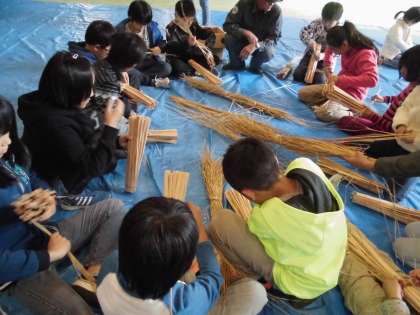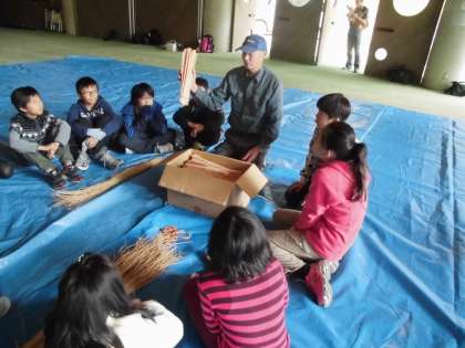 午後1時から体育場{森愛館}で,たいまつ作りに挑戦しました。作ったたいまつは,夜に点火する予定です。