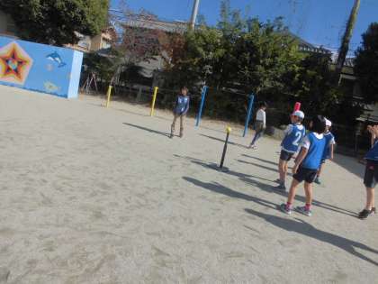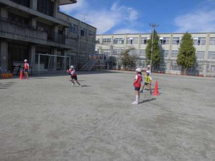 5年2組では体育でベースボールの学習に取り組んでいます。4チームに分かれ,どのように攻めると点が入るのか,守りはどこを工夫したらいいのかなどの作戦を考えて試合を行いました。