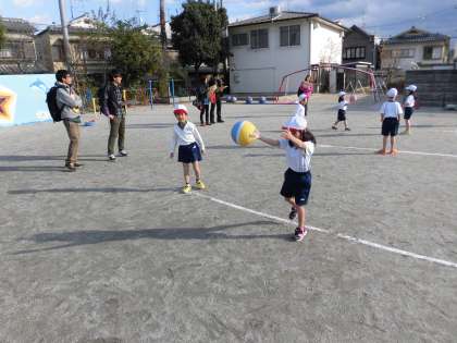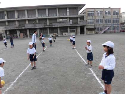 1年生は体つくり運動領域の「ボールあそび」の学習を見ていただきました。