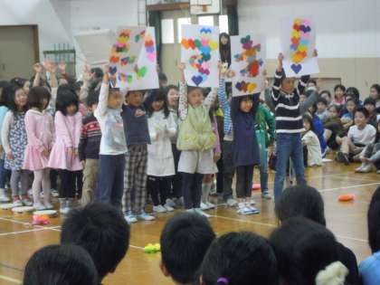 6年生に「ありがとう」の気持ちを込めて、歌と言葉のプレゼントをしました。最後に、「うーーー大好き!」の言葉と大きなハートの文字を出すと、6年生も思わずにっこり。気持ちは、しっかり届きました!