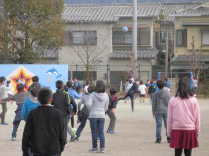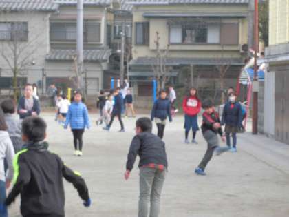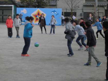 運動場で寒さに負けず,元気よくドッジボールをしました。