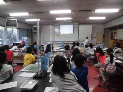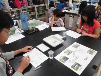 1組の実験学習では水についての学習です。実際に水を採取して透明度をはかる実験をしました。