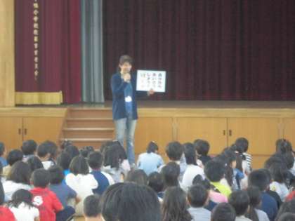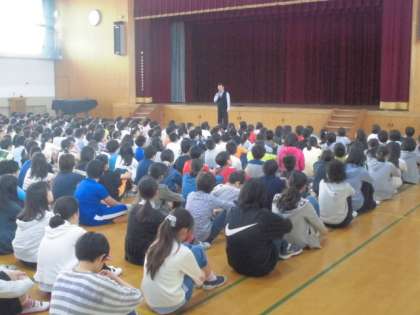 5月は憲法月間です。まず,校長先生が憲法月間にちなんで日本国憲法の3原則「国民主権」「平和主義」「基本的人権の尊重」について子ども達にわかりやすく話をしました。