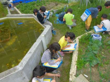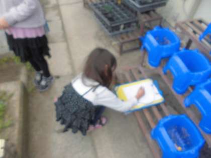子ども達は花壇や池の周りに行って自分が興味を示す動物や植物を虫眼鏡を使って調べました。
