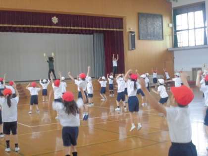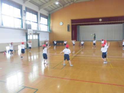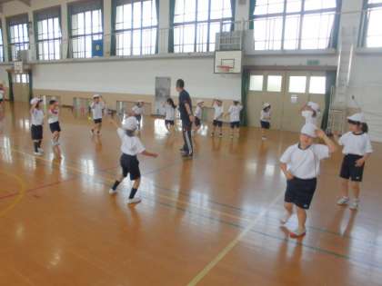 体育館で曲に合わせて踊りました。子どもの中には踊り方を覚え,大きく上手に踊れるようになってきている人もいます。