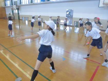 体育館で団体演技の練習を行いました。