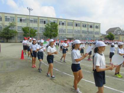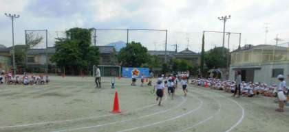 全校練習の後半は下鴨音頭の練習を行いました。先日から2回保存会の皆様方に教えていただきましたので上手に踊れていました。その後リレーの練習をしました。全校児童の声援を受けて,リレーに出る子ども達は張り切っていました。最後に応援練習も行いました。