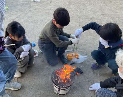 社会科の学習では、昔のくらしや市の様子のうつりかわりに学習をしています。今日は、地域の方々に教えてもらいながら、七輪を使っておもちを焼きました。