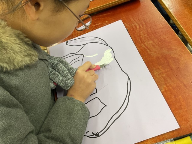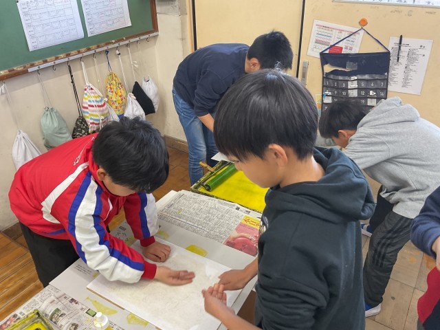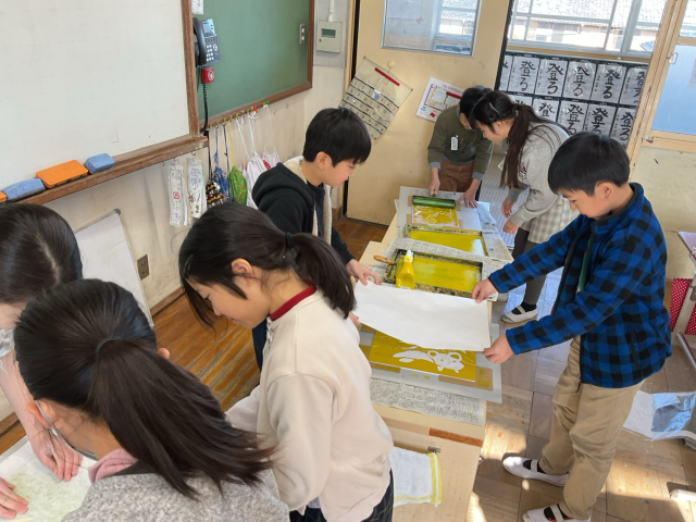 図画工作科の版画制作では、刷る場面で声をかけ合い、紙を押さえたり位置を確認したりしながら協力して取り組んでいます。友だちと支え合いながら、一枚一枚丁寧に刷り上げる姿が見られます。