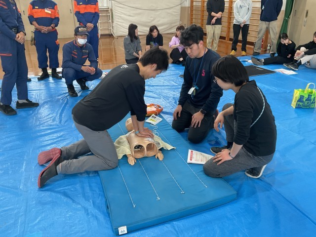 AEDの使用方法や胸骨圧迫、喉に食べ物が詰まった時の対処法などを実技を中心に学びます。