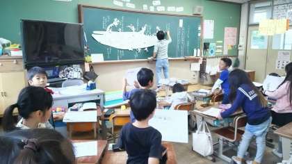 国語科 こえにだしてよもう くじらぐも の単元の学習の様子です。くじらぐもにのって空を旅する子どもの気持ちになって,会話を想像することができるようにするため,黒板には,大きなくじらぐもや人形を掲示して学び進めます。