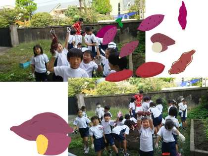 生活科 ぐんぐんそだて の単元の学習のです。この1週間で,これまで育ててきたサツマイモの収穫・観察・収穫祭を行いました。
