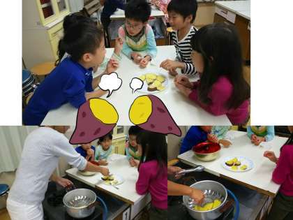 <下>収穫祭! ふかしイモにして,味わいながら,喜びを語り合いました。