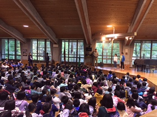 2日目朝。朝の集いの様子です。大宮小学校,下鳥羽小学校と合同で互いに学校紹介をしました。葵校の代表の子どもも立派に学校紹介ができました