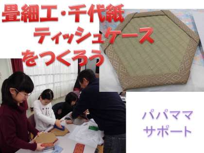 今回のパパママサポートは,「畳細工体験,千代紙ティッシュケース作り」です。地域の方,サポートメンバーの方にお世話になり,自分だけのオリジナルコースターやケースができました。