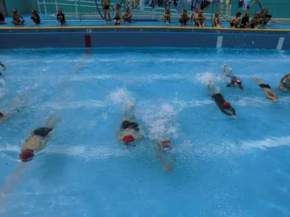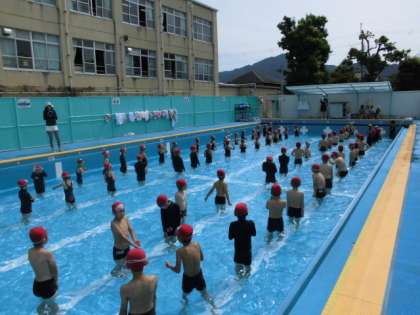プールサイドでの約束や,準備運動の仕方を確かめたあと,
