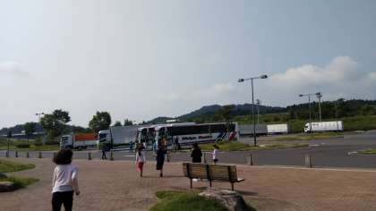 <上:出発式の様子 中:バスに乗り込みます 下:バスの休憩地>